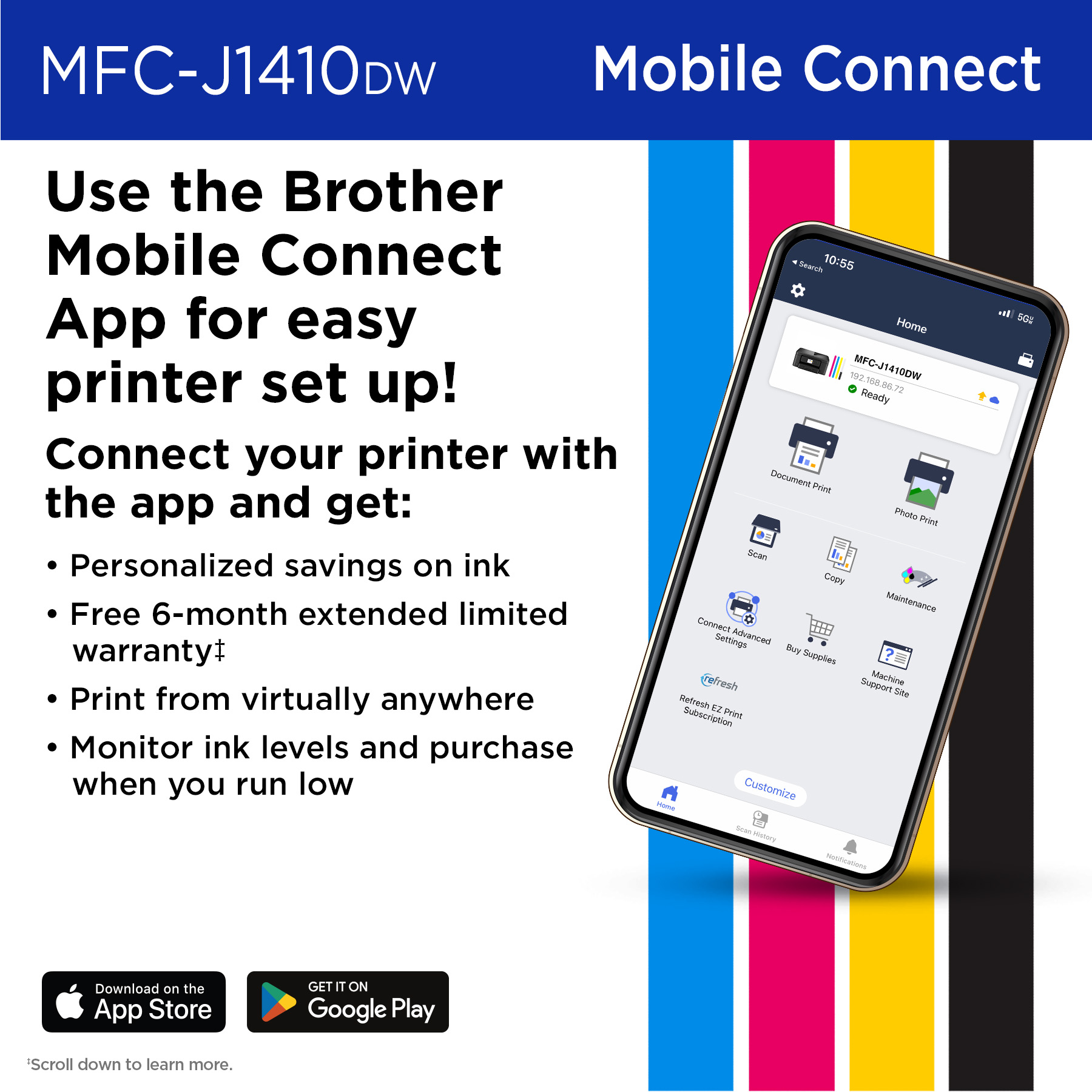 Imagine the possibilities when your phone and your Brother printer work together. You'll get easy step-by-step setup, personalized offers, access to your customizable printer dashboard, a mobile history of scans saved automatically, and the ability to print on the go from virtually anywhere(2).