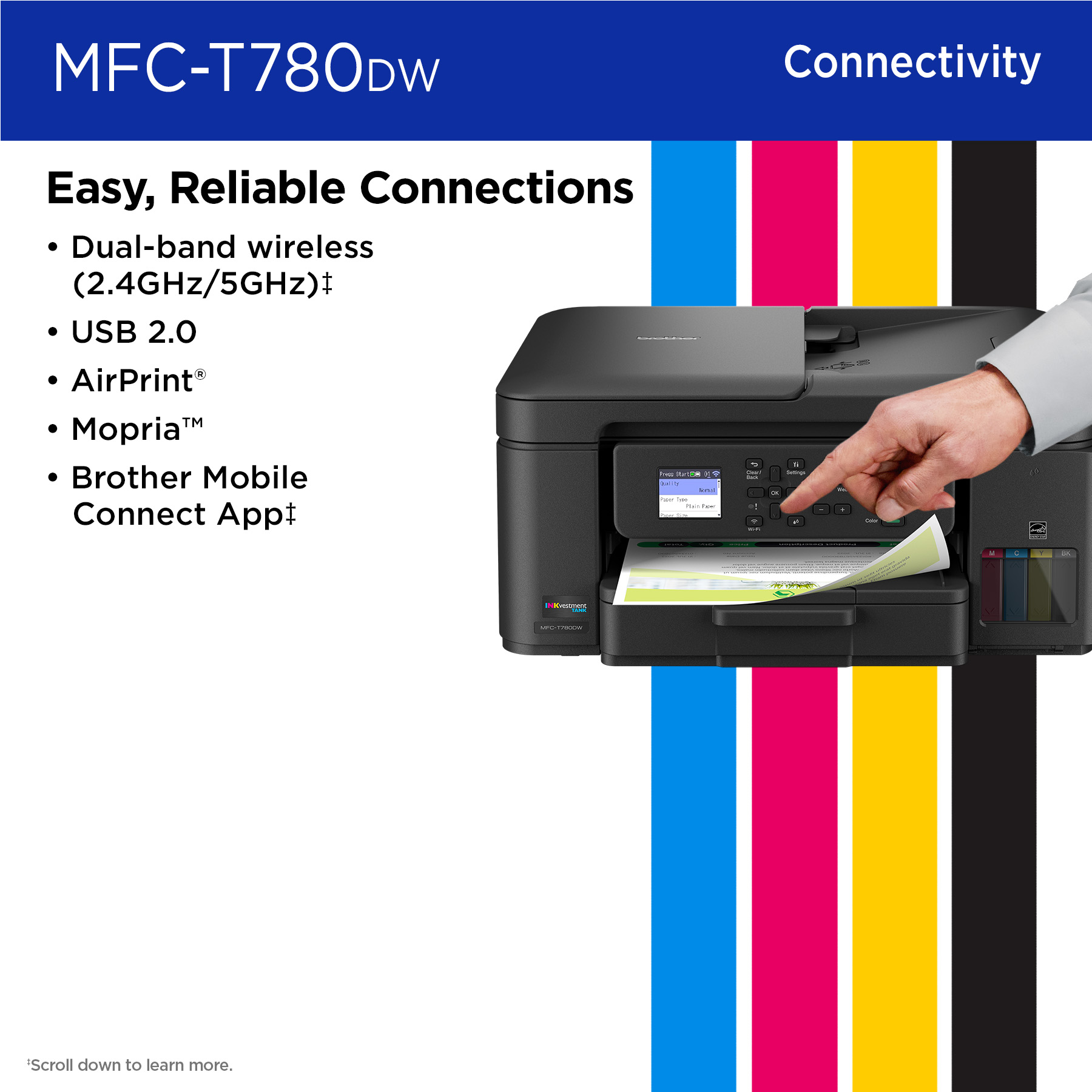 The Brother INKvestment Tank MFC-T780DW Wireless Colour Inkjet All-in-One Printer with Duplex Printing includes three years of ink(3) for worry-free printing plus a refillable tank. Enjoy an easy-to-load 150-sheet paper tray,(1) automatic document feeder (ADF), automatic duplex printing, and the ability to print from virtually anywhere with the Brother Mobile Connect app.(4)