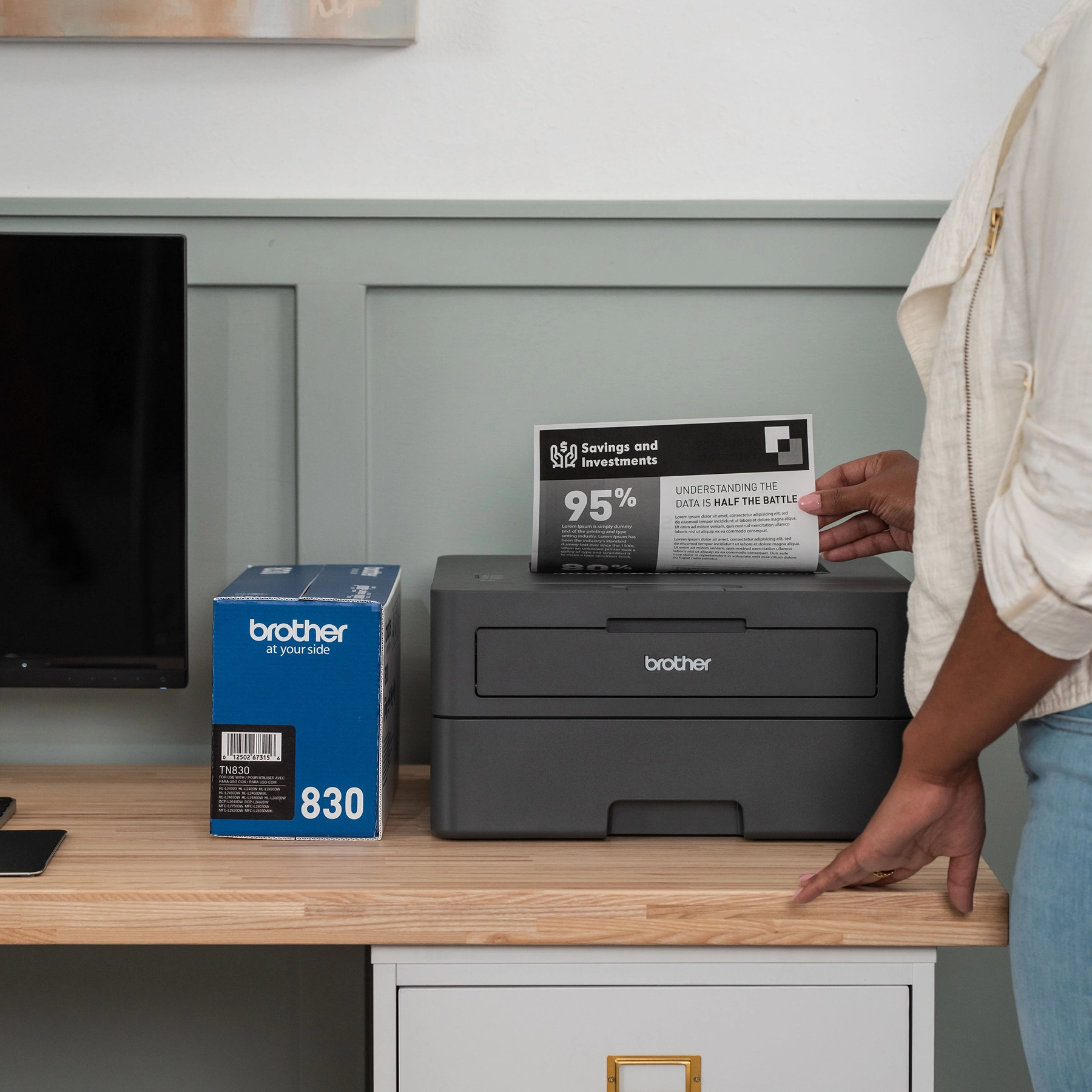 Engineered for quality, consistency, and reliability, this printer uses Brother Genuine TN830 standard-yield and TN830XL high-yield toner to deliver exceptionally sharp black-and-white documents that won’t smudge or fade over time.