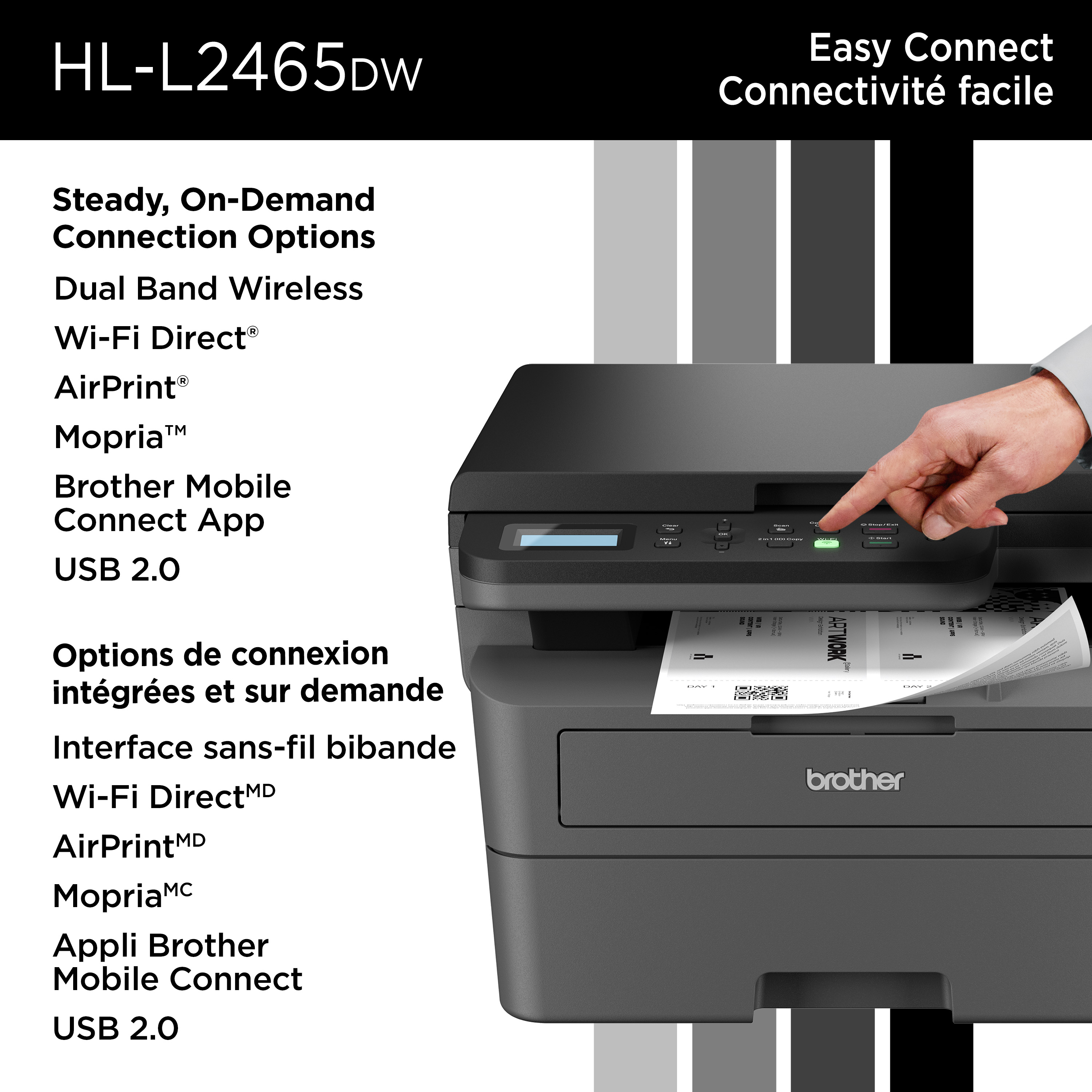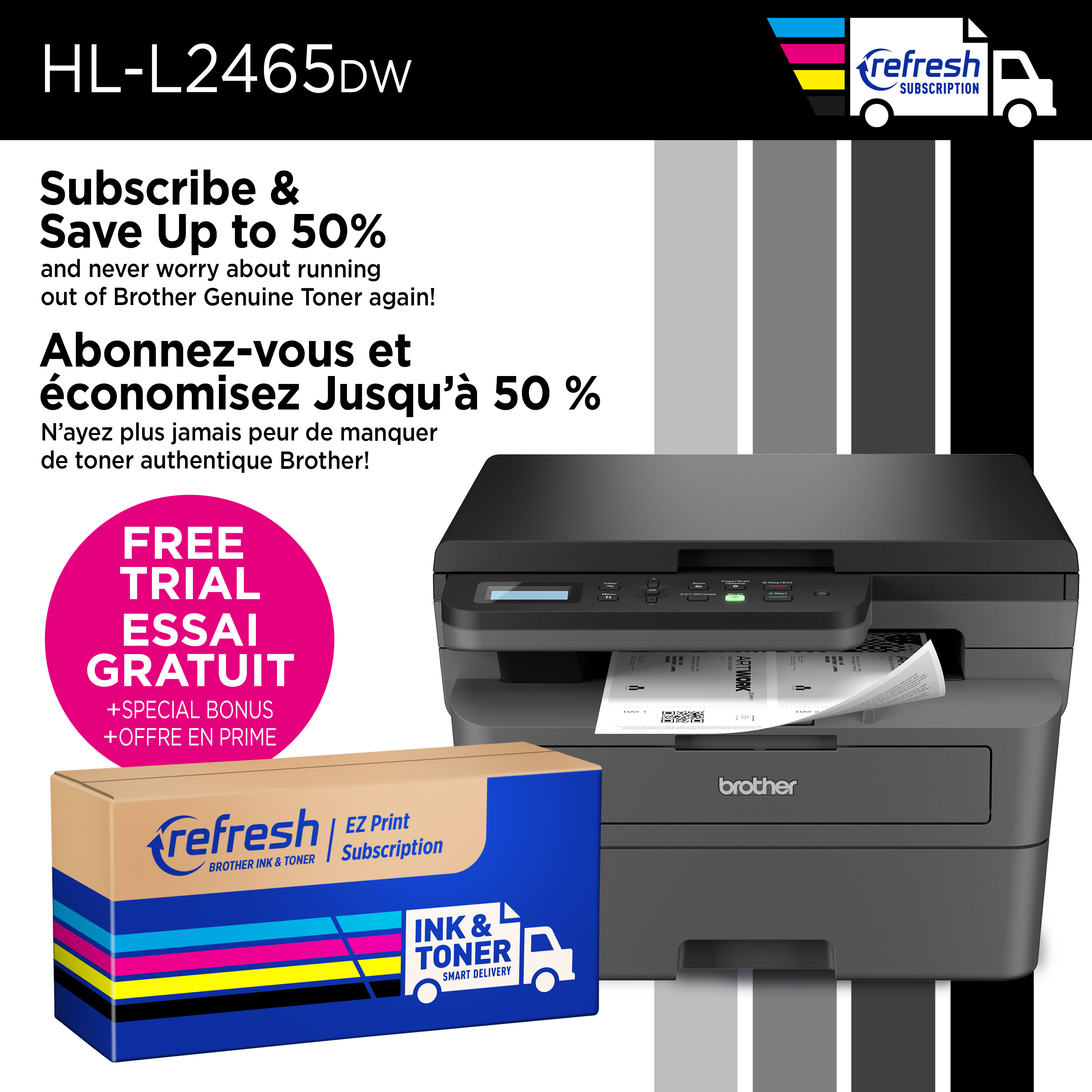 Offering black and white print, copy, and scan capabilities in an affordable and efficient solution, the Brother HL-L2465DW Wireless Compact Monochrome Multifunction Laser Printer is a smart choice for high-volume printing, copying, and scanning. This compact wireless printer produces crisp, clear documents at speeds of up to 30 ppm,(1) with automatic duplex printing and a 250-sheet paper tray(2) to ensure quick results. Copying or scanning documents is convenient thanks to the flatbed scan glass. Flexible connection options including dual-band wireless and USB 2.0., plus the Brother Mobile Connect app(3) make it possible for you to use your printer from virtually anywhere. Advanced security features protect your machine from unauthorized use and keep sensitive documents safe. And because it’s Refresh EZ Print-Ready, you can enjoy the perfect mix of convenience and savings when you subscribe to save up to 50% on toner, like the Brother Genuine TN830, delivered to your door before you know you need it.(4) 1. Based on one-sided printing. Change from default setting required. 2. Maximum capacity based on using 20-lb. paper. 3. Free app download and wireless connection required. Compatibility may vary by device and operating system. 4. Requires enrollment in a monthly billed Brother Refresh EZ Print Subscription service plan based on monthly printed page allotments. For full details or to enroll, visit https://www.brother.ca/en/refresh.