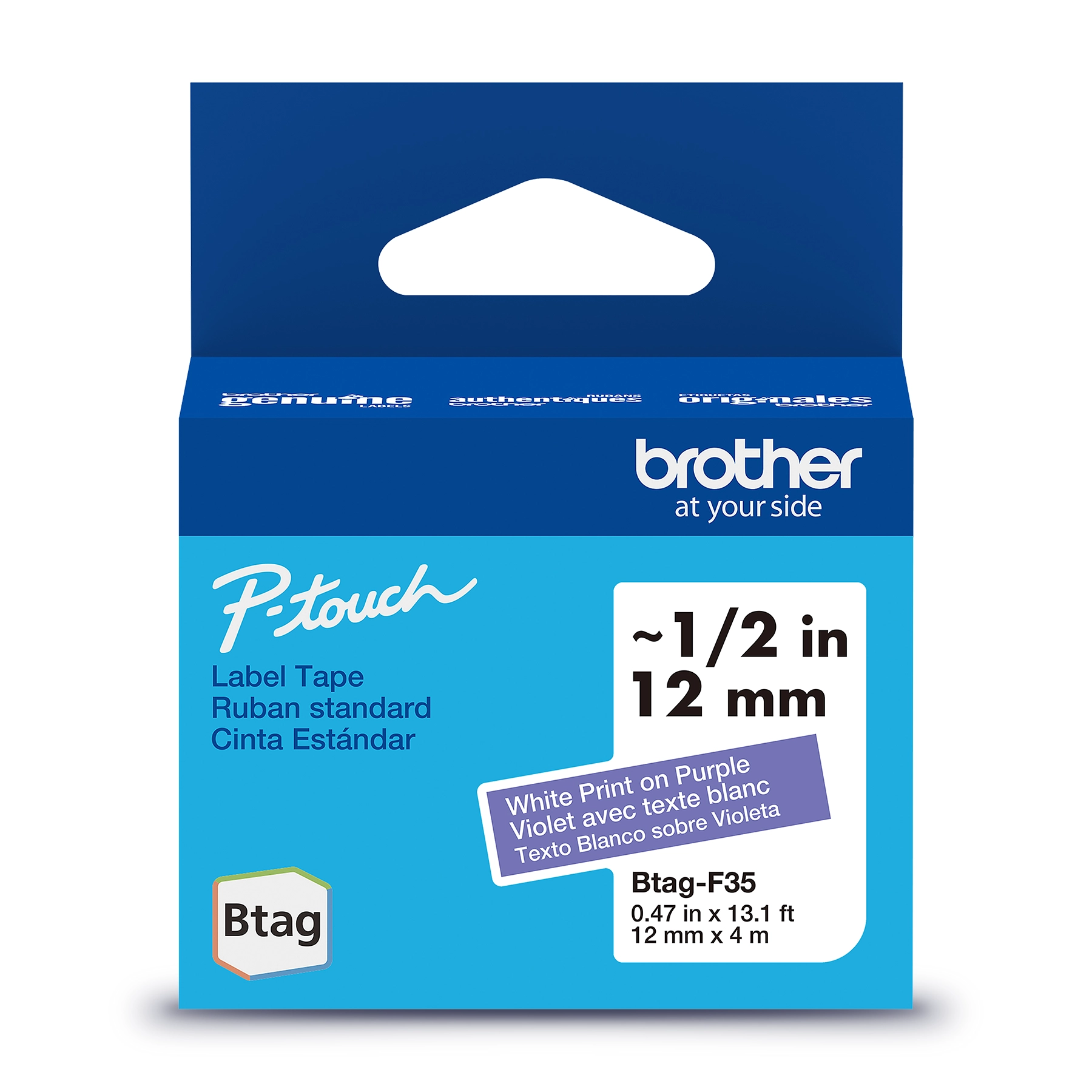 Brother BTAGF35 Ruban non laminé violet avec texte blanc authentique pour étiqueteuse P-touch, 12 mm (L) x 4 m (l)