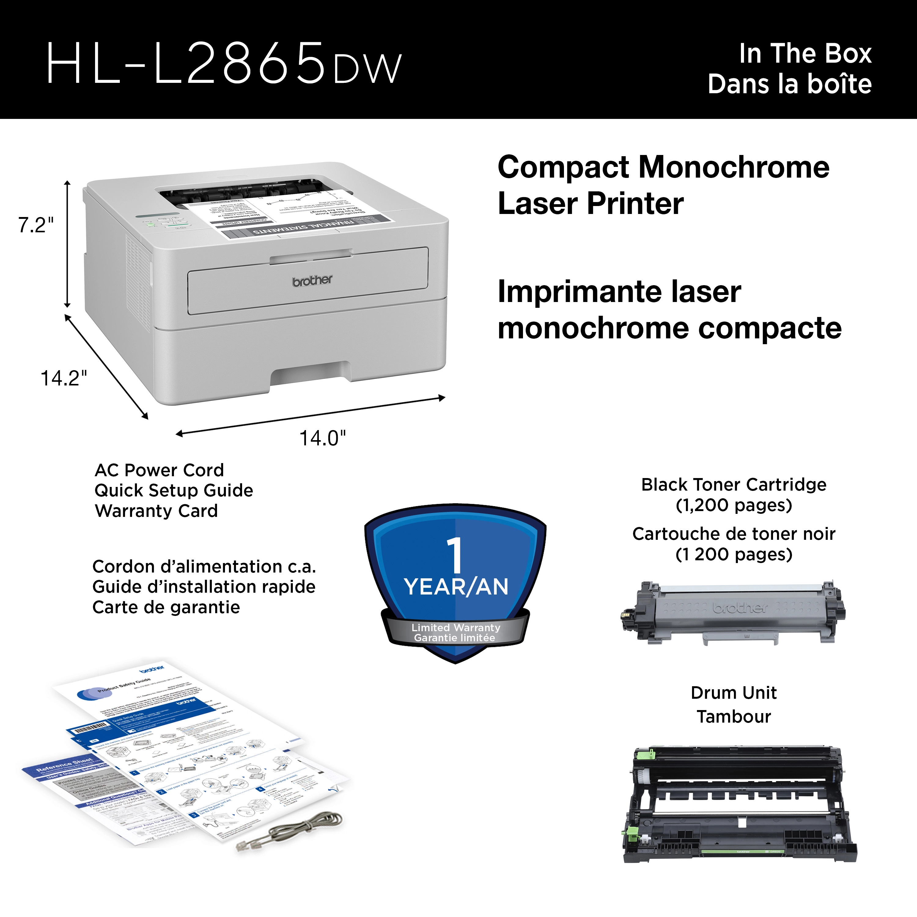 | Contenu de la boîte | Brother HL-L2865DW, TN830 Cartouche de toner (1 200 pages), DR830 Tambour (15 000 pages), cordon d’alimentation c.a., carte de garantie, guide d’installation rapide |