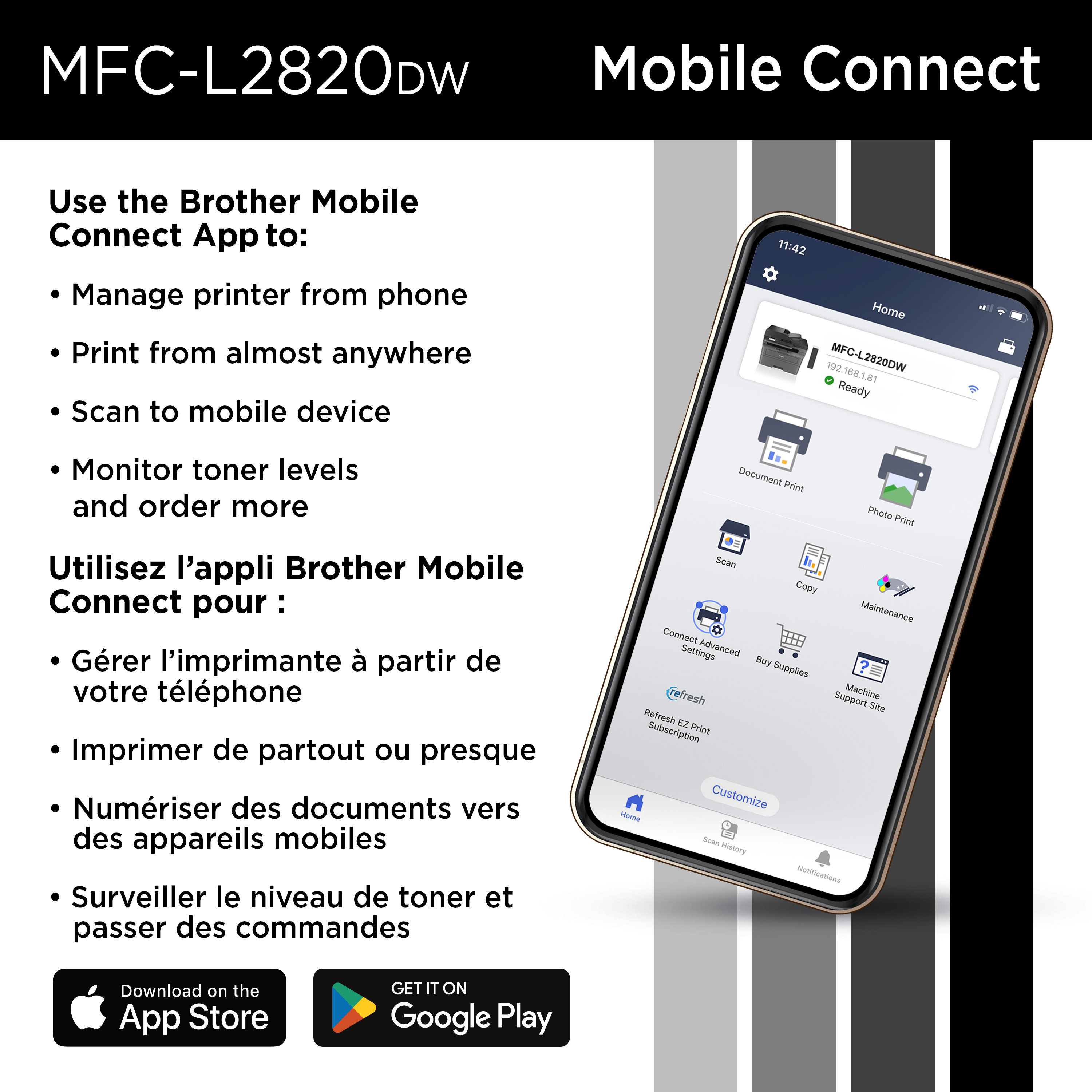 - L’appli Brother Mobile Connect vous suit partout. Cette appli gratuite vous permet de gérer votre imprimante à distance, d’imprimer à tout moment et pratiquement partout. De plus, elle vous permet de commander des fournitures authentiques Brother, de suivre votre consommation de toner et de travailler en déplacement.4