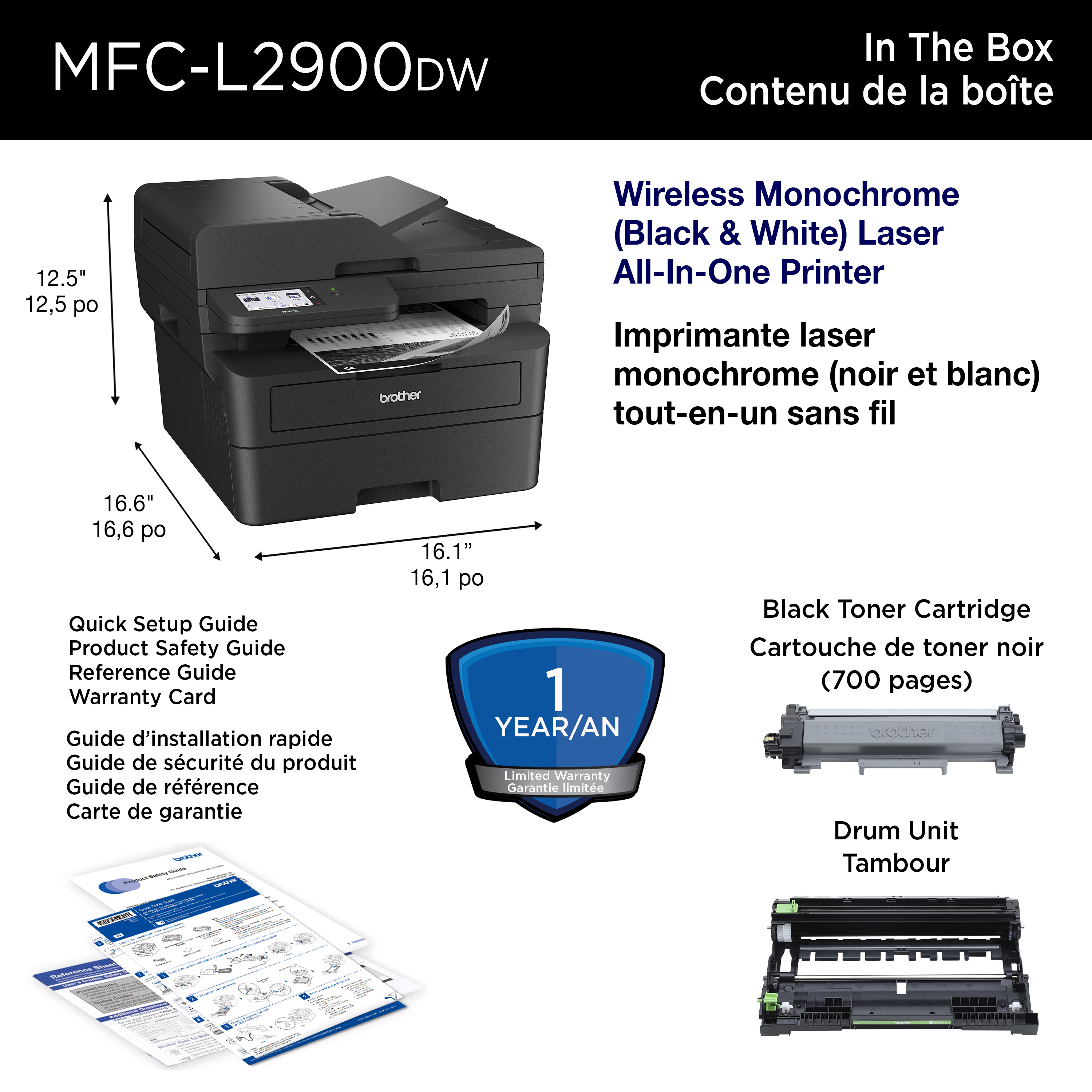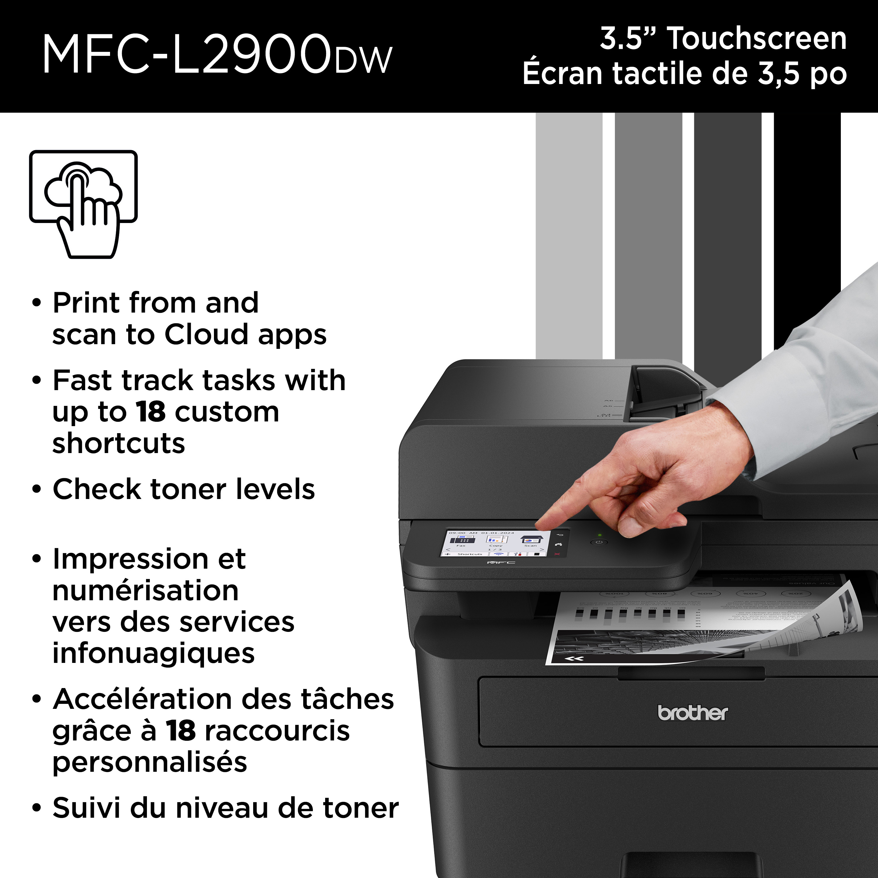 Exceptionnellement efficace, l’imprimante tout-en-un laser monochrome sans fil compacte MFC-L2900DW de Brother est une solution abordable pour imprimer, copier, numériser et télécopier des volumes élevés de documents en noir et blanc. De format compact, elle occupe peu d’espace sur votre bureau tout en offrant un maximum d’efficacité pour gérer vos affaires. Rapide et fiable, elle produit constamment des documents clairs et nets, faciles à consulter et à transférer(1). Offrant des vitesses d’impression allant jusqu’à 36 ppm, elle permet de gérer aisément les tâches d’impression volumineuse. De plus, elle offre plusieurs fonctionnalités qui vous feront gagner du temps, comme l’impression recto verso automatique, un bac à papier de 250 feuilles(2), un chargeur automatique de documents de 50 pages, la numérisation recto verso en un seul passage facilitant la numérisation et la télécopie de documents de plusieurs pages. Son grand écran tactile intégré de 3,5 po la rend encore plus pratique, facilitant la navigation ainsi que l’impression et la numérisation à partir d’applications en nuage (3). Ses options de connexion flexibles, comme une interface sans fil bibande, Ethernet et USB 2.0, combinées à l’application Brother Mobile Connect, vous permettent d’utiliser votre imprimante où que vous soyez. De plus, ses fonctions de sécurité avancées protègent votre appareil contre toute utilisation non autorisée et gardent les documents sensibles en sécurité. Compatible avec l’Abonnement Refresh, cet appareil est à la fois pratique et économique. En vous abonnant à Refresh, vous pouvez économiser jusqu’à 50 % sur le toner(4), comme les cartouches de toner authentiques TN830 de Brother. De plus, les cartouches sont livrées directement à votre domicile, au bon moment. Avec toutes ces caractéristiques adaptées aux besoins des entreprises, cet appareil s’avère un choix judicieux. 1. Impression recto. Modification des paramètres par défaut requise. 2. Capacité maximale basée sur l’utilisation de papier 20 lb. 3. Application téléchargeable gratuitement et connexion à un réseau sans fil requises. La compatibilité peut varier selon le type d’appareil et le système d’exploitation. 4. Nécessite un abonnement mensuel payant au service Abonnement encre et toner Refresh de Brother en fonction du nombre de pages imprimées par mois. Pour en savoir plus sur l’Abonnement encre et toner et vous inscrire, visitez : https://www.brother-usa.com/supplies/subscription-info. 5. Vitesse de numérisation monochrome selon la norme ISO/IEC 17991, avec toutes les fonctionnalités avancées éteintes, au format Lettre à 300 ppp. 6. Application téléchargeable gratuitement et connexion à un réseau sans fil requises. La compatibilité peut varier selon le type d’appareil et le système d’exploitation.