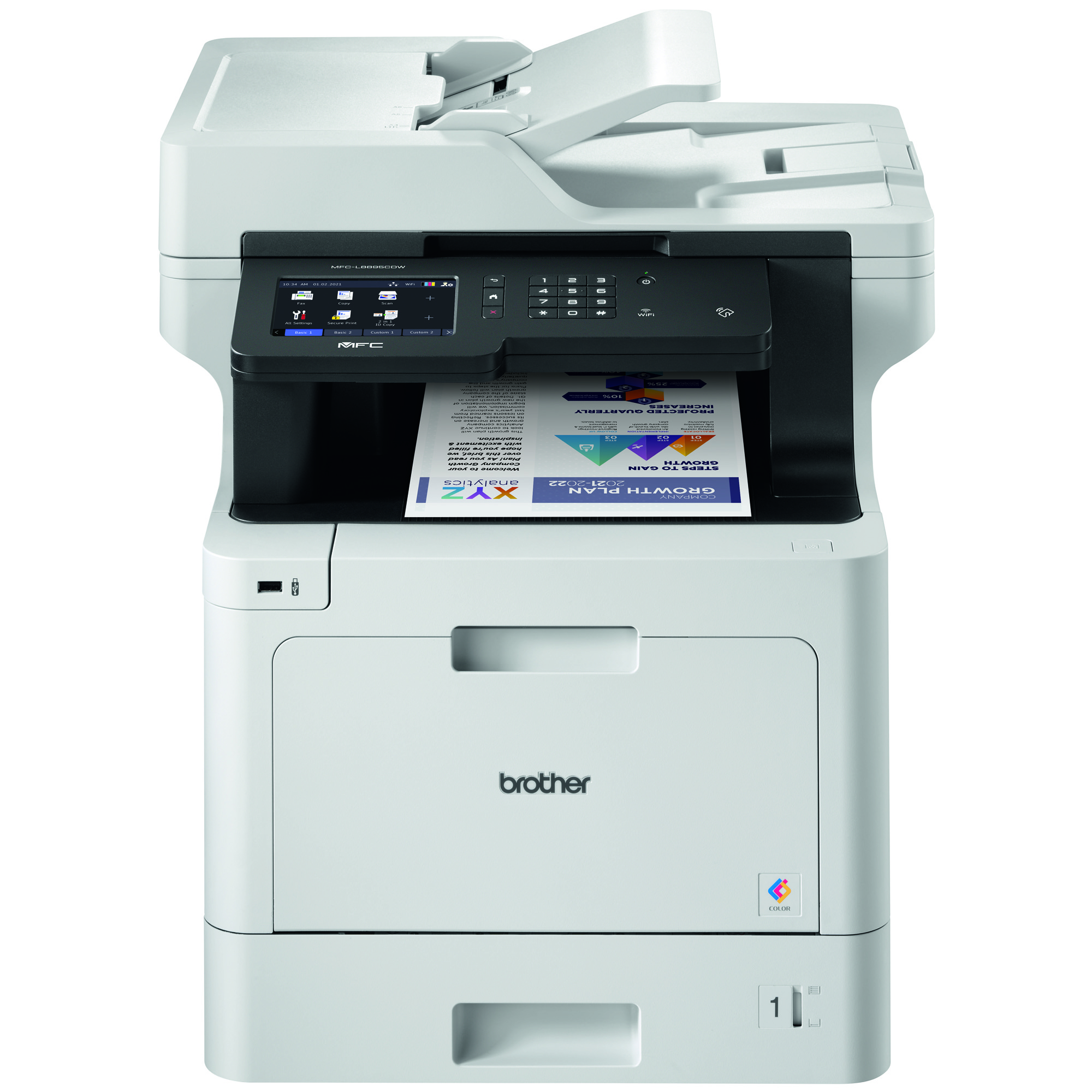 L imprimante multifonction laser couleur professionnelle MFC-L8895CDW de Brother est idéale pour les petits groupes de travail ayant un volume d impression élevé qui sont à la recherche d une solution d impression économique, de numérisation facile, de gestion de documents sécuritaire et fiable et de production de documents de qualité professionnelle. Cette imprimante multifonction hautement performante offre un excellent rapport qualité-prix puisqu elle vient avec l équivalent de 1 500 pages supplémentaires de toner, pour un total de 4 500 pages. De plus, elle vous aidera à augmenter votre productivité grâce à ses vitesses d impression rapides allant jusqu à 33 ppm et ses vitesses de numérisation recto verso allant jusqu à 58 ipm. Équipée de fonctions de sécurité avancées, cette imprimante permet de limiter l accès aux documents et aux fonctions de l appareil, et protège celui-ci contre les intrusions réseau. Elle vous permet aussi de définir des règles pour l utilisation de l impression couleur en fonction des appareils et des utilisateurs pour assurer votre sécurité et vous aider à économiser. Cette imprimante comprend également un écran tactile couleur 5 po qui vous permet de créer jusqu à 64 raccourcis pour simplifier vos flux de travail et un bac à papier réglable de 250 feuilles pour format lettre ou légal, qui vous évite les chargements de papier fréquents. Elle offre aussi des options de gestion flexibles du papier qui permettent d augmenter la capacité papier jusqu à 1 300 feuilles à l aide des bacs de 250 et de 500 feuilles offerts en option. Et aussi, elle offre des options de connectivité flexibles au réseau Gigabit Ethernet ou sans-fil ainsi que des options d impression pratiques à partir d appareils mobiles.