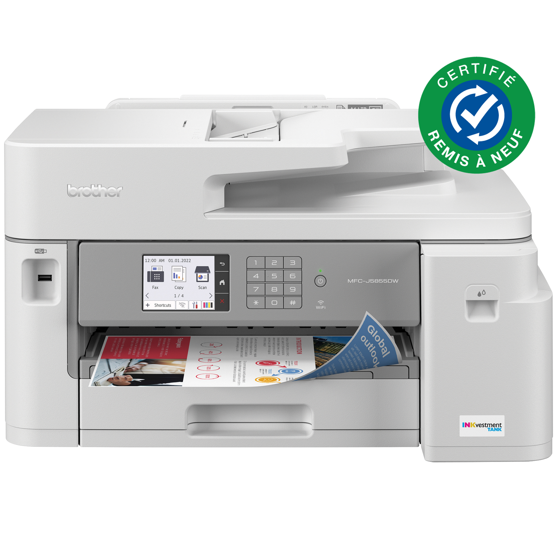 Écoresponsable, l'imprimante tout-en-un à jet d'encre couleur INKvestment Tank MFC-J5855DW - remise à neuf - de Brother avec fonctions de sécurité à 3 couches permet d 'mprimer, copier, numériser et télécopier depuis un ordinateur, un appareil mobile ou l'écran tactile couleur ACL de 3,5 ... Voir la description complète du produit