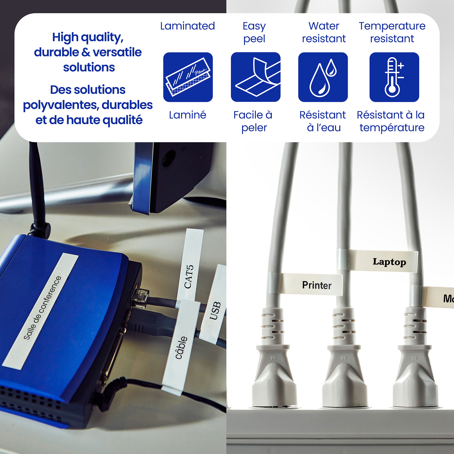 - Étiquettes avec endos fendu facilitant leur application.