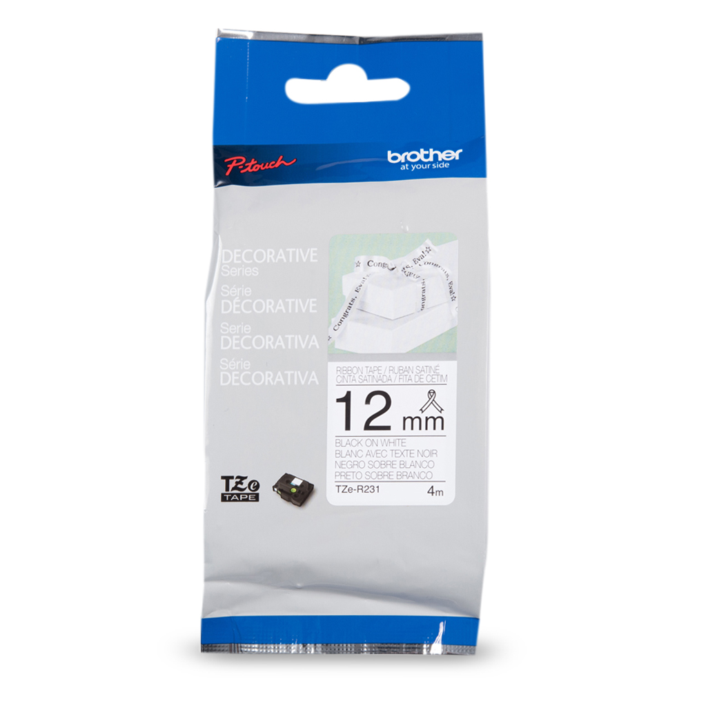 Brother TZER231 Ruban décoratif satiné blanc avec texte noir authentique pour étiqueteuses P-touch, 12 mm de largeur x 4 m de longueur